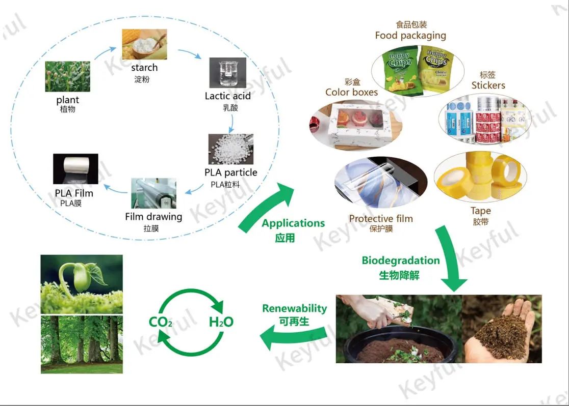 特點與工藝:原料由非轉(zhuǎn)基因植物淀粉(如玉米)發(fā)酵制成,通過雙向拉伸(BOPLA)工藝提升拉伸強度,性能優(yōu)化,各種光啞效果,通過涂布技術(shù),可以有不同啞度的效果及手感,以及阻隔性能。