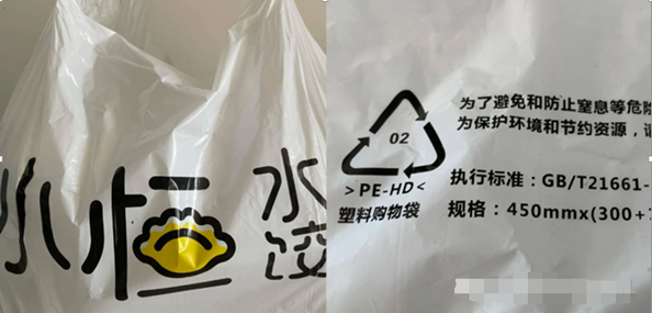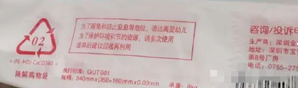2.觀察外觀:全降解塑料袋的原材料是PLA、PBAT、淀粉或礦粉材料,在外袋上會(huì)有專門的標(biāo)志,比如常見(jiàn)的“PBAT+PLA+MD”,而對(duì)于偽降解塑料袋,原料是PE等材料,常見(jiàn)的包括”PE-HD“等。